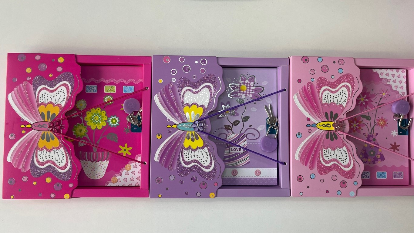Dnevnik na ključek pakiran v darilni embalaži, motiv metuljčka, tri različne barve roza, temno roza in vijolična. Velikost 18 x 2,5 x 18cm
