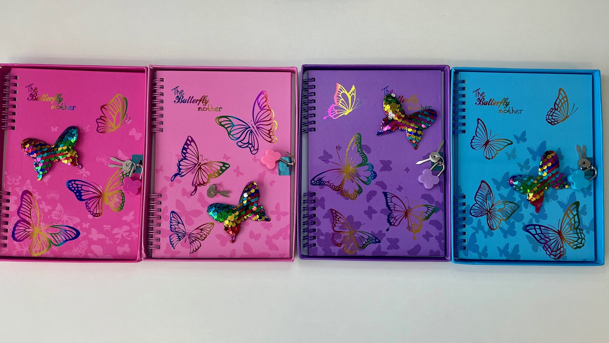 Dnevnik s ključavnico, spiralno vezavo ter raznobarvnimi listi, z motivom metuljčki. Pakirano v darilni embalaži. Velikost dnevnika 16,5 x 22 x 1,2 cm. Za mlada dekleta, 4 različne barve. 7+