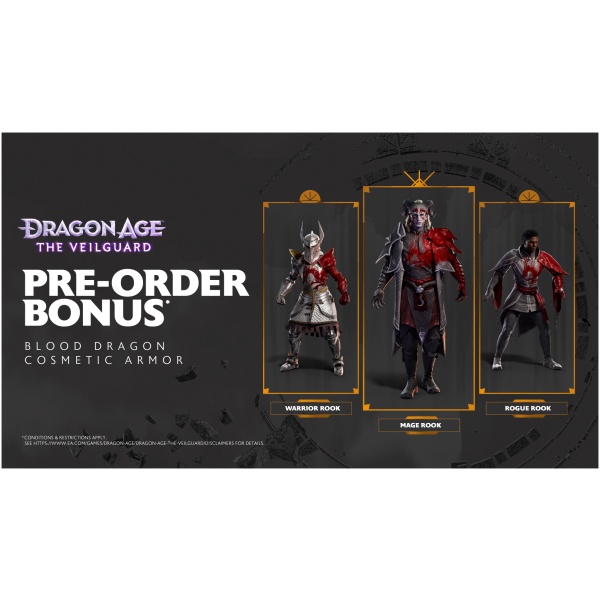 S prednaročilom* prejmete oklep Blood Dragon za vse tri razrede: Warrior, Mage in Rogue. Škrlatni madeži na tem oklepu, ki se spominja prejšnjih iger Dragon Age, ne bodo nikoli zbledeli.
