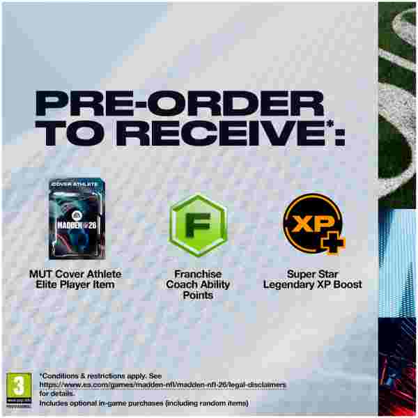 Prednaroči* EA SPORTS™ Madden NFL 26 in prejmi:● Elitni igralni predmet z naslovnice za način MUT● Točke sposobnosti trenerja v načinu Franchise● Legendarni XP pospešek za način Super Star