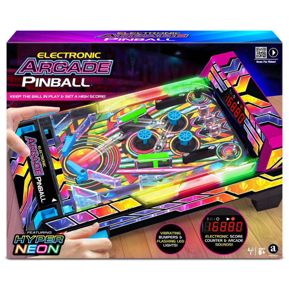 Z elektronskim fliperjem lahko doživite vzdušje in vznemirjenje igralnih salonov kar pri sebi doma! Ta najbolj tipična arkadna igra zagotavlja obilo zabave v kompaktnem kompletu. Tako kot na fliperjih v igralnih salonih je tudi tu cilj doseči čim več točk, preden žogica tretjič uide med ročki. Izstrelite žogico in igra se začne. Ob spremljavi značilnih zvokov in glasbe velika elektronska tabla beleži vaše točke. Elektronski fliper premore vse funkcije pravega igralnega avtomata – tarče dejansko zavibrirajo, ko žogica zadane ob njih, kar zagotavlja pristen občutek igranja! Pisane LED lučke na obeh straneh naprave zasvetijo, ko zberete točko in dosežete določen mejnik, zvočni učinki pa vzemirjenje še povečajo. Naprava zazna, če žogica uide med ročki, in beleži vaše dosežke. Igralci se lahko med igro izmenjujejo in vsak lahko poskuša postaviti nov rekord! Za 1 ali več igralcev. Potrebne so 3 baterije tipa AA (niso priložene). Priporočeno za starejše od 6 let.