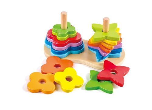 Pisana natikanka bo vaše malčke zabavala saj ob natikanju cvetov in zvezde, nastajajo čudoviti mavrični stolpi. Otroci skozi igro spoznavajo barve in oblike, urijo svoje finomotorične spretnosti ter krepijo sposobnost vizualizacije. Velikost igrače je 20 cm x 10,5 cm x 10,8 cm. Narejeno iz lesa. Primerno za starost 12m+