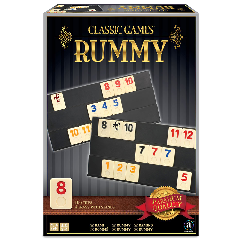 Remi – klasična igra, izdelana iz vrhunskih materialov. 106 igralnih ploščic in 4 črna stojala v lični in kakovostni darilni embalaži s pozlačenim napisom.