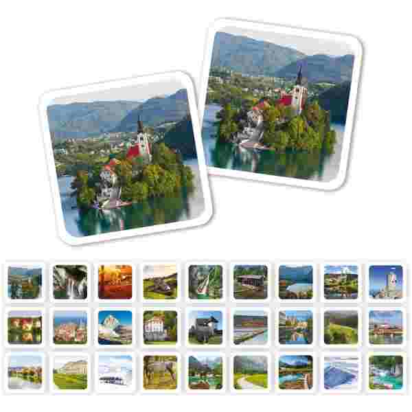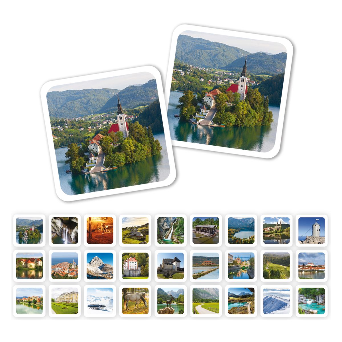 Navodila za igro: Karte premešajte, preden jih položite na mizo z licem navzdol. Kako dobro poznate Slovenijo? Ko najdete vse pare, je igre konec. Kdor ima največ parov, zmaga.