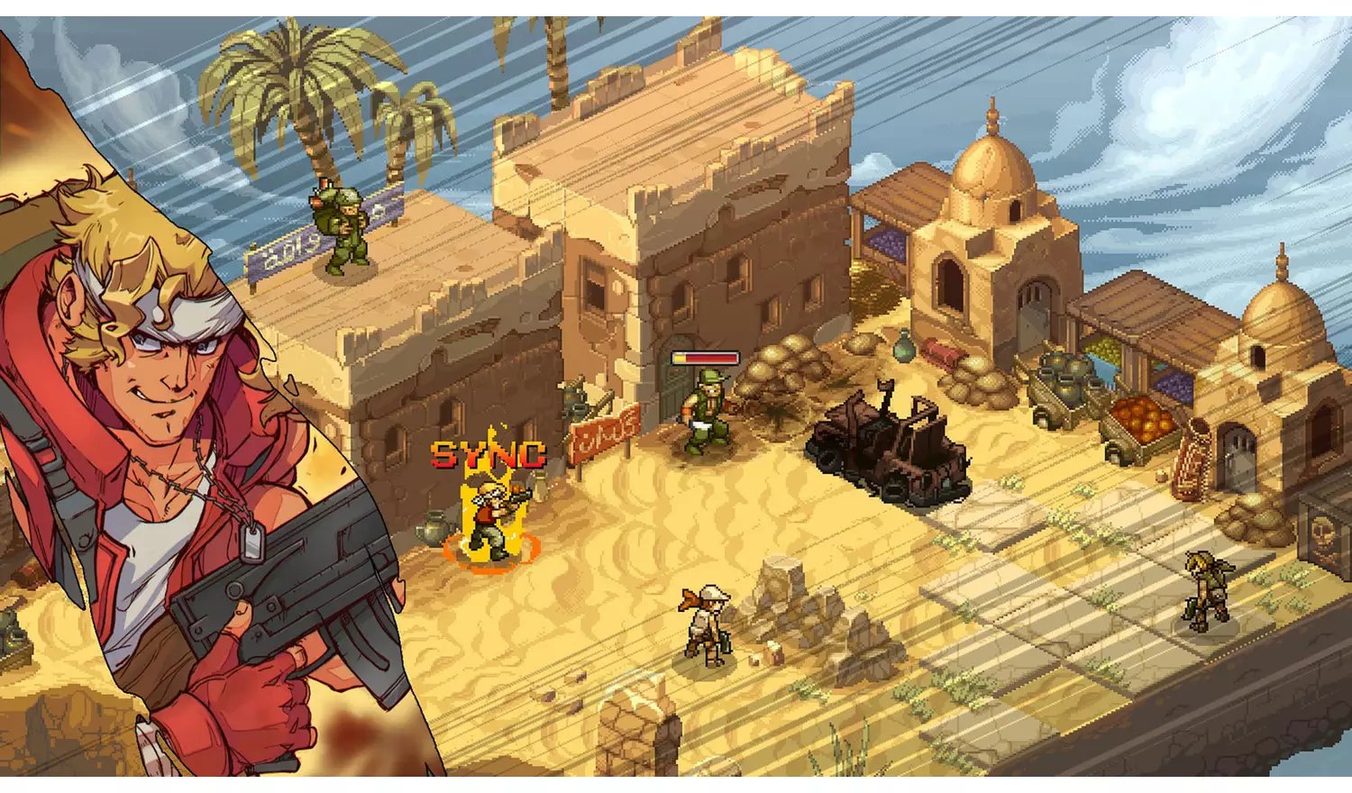 Določite najboljše orožne kombinacije in izboljšave, da maksimirate učinkovitost kombinacij na bojišču. Z “Sync” mehaniko izvedite simultane napade in sovražniku zadajte ogromno škodo! Če pa bo vaša ekipa v težavah, lahko vedno pokličete okrepitve in opazujete moč težkega orožja v akciji: težko artilerijo, zračne napade, legendarni Metal Slug – kar koli potrebujete, to tudi dobite!