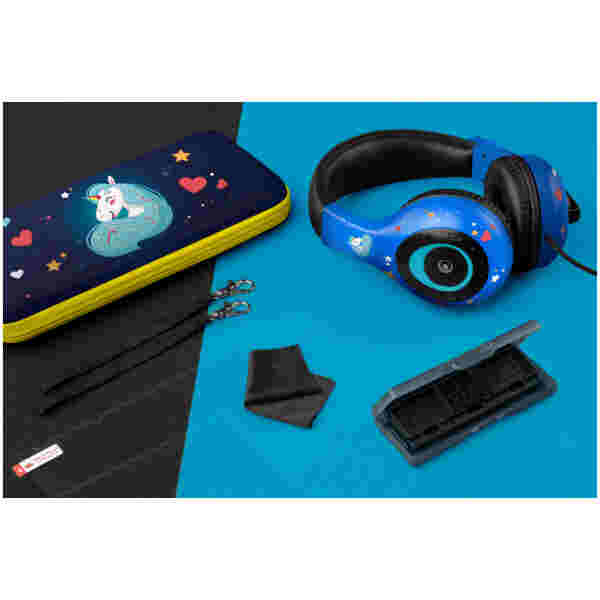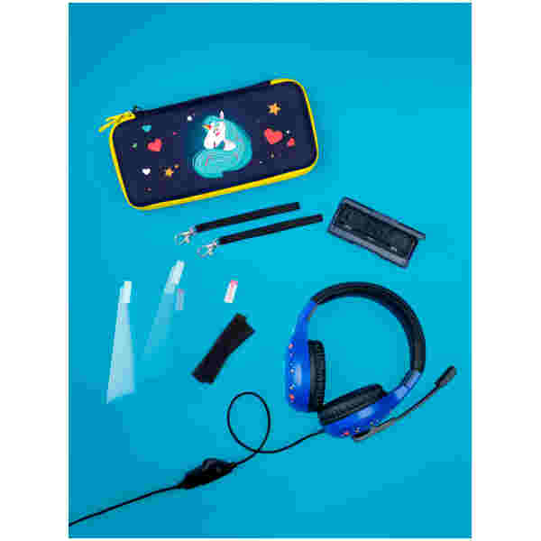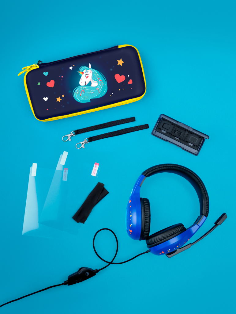 NACON 6 IN 1 UNICORN PACK FOR NINTENDO SWITCH & SWITCH LITE je čudoviti komplet dodatkov v stilu samoroga za Nintendo Switch in Nintendo Switch Lite! Paket vključuje slušalke, dve zaščiti za zaslon, trdi etui za shranjevanje, škatlo za igralne kartice in dva zapestna pasova. Stereo igralne slušalke imajo 40-milimetrske zvočnike in mikrofon, s katerimi lahko kar najbolje izkoristite svojo igro. Ta paket zagotavlja optimalno zaščito, saj prejmete trdo torbo za shranjevanje, s katero lahko vaš Nintendo nosite povsod. Dve zaščiti za zaslon ščitijo vaš zaslon pred umazanijo, maščobo in praskami. V škatli za igralne kartice vzemite s seboj tudi vse svoje najljubše igre, do šest kosov. In končno, vaš Nintendo vam ne bo nikoli padel iz rok zahvaljujoč dvema zapestnicama.