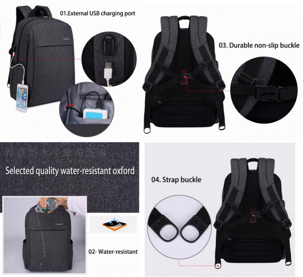 Eleganten nahrbtnik za prenosni računalnik je izdelan iz visoko kvalitetnih, vodoodbojnih materialov. Žepi nahrbtnika so zaščiteni s posebej zasnovano dvojno zadrgo, ki jo lahko zaklenete s ključavnico, tako je vsebina zmeraj varna pred nepridipravi. Posebej priročen je USB izhod, na katerega priklopite prenosno baterijo in napolnite telefon ali tablico. Oblazinjen predal na zadnjem delu nahrbtnika je namenjen shranjevanju prenosnega računalnika do 15.6˝, na hrbtnem delu je tudi skrit predal za shranjevanje vaših vrednejših predmetov. Naramnice, s trakcem za varno shranjevanje očal, so obložene in prilagodljive, hrbtni del zračen in namenjen dolgotrajnemu nošenju.