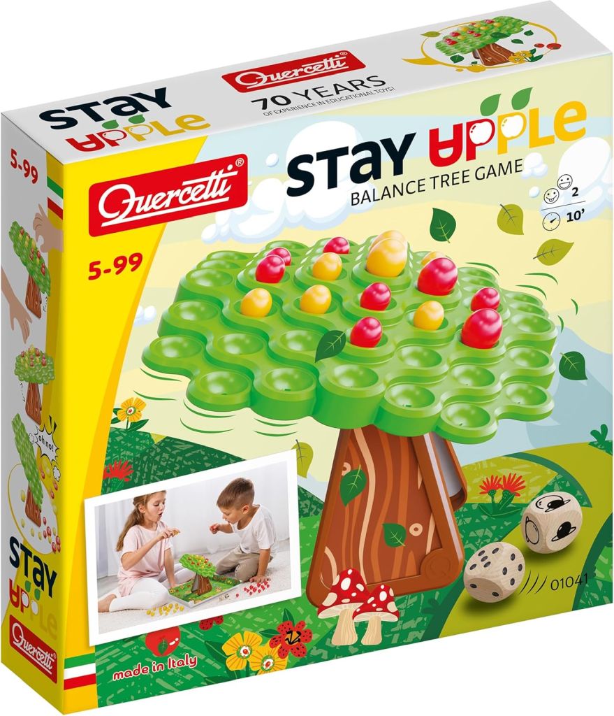 Quercetti drevo ravnotežja je igra primerna za otroke starejše od 5. leta starosti in tudi za odrasle. Namenjena je igri enega ali dveh igralcev. Z igro preizkušamo občutek ravnotežja in zakon gravitacije. 1 igralec: z nameščanjem "jabolk" na krošnjo poskuša ohraniti ravnovesje. na krošnjo naj postavi čim več "jabolk" katerekoli barve. Za 2 igralca: Vsak igralec ima svojo barvo jabolk (rumena ali rdeča). Izmenično previdno nameščata po eno jabolko na zibajočo krošnjo. Pri tem morata razmišljati kam jabolko umestiti, da se krošnja, zaradi prevelike teže na eni strani ne prevrne. Igra s kockami: Za igro igralca uporabita obe kocki. Ena od kock prikazuje katero jabolko je potrebno postaviti na krošnjo (malo jabolko, veliko jabolko, obe jabolki ali pa preprosto preskočiš svojo potezo). Druga kocka prikazuje na katero označeno pozicijo postaviš svoje jabolko. Označene so od 1 do 6. Pri tem pa je potrebno ohranjati ravnovesje! Zmagovalec je tisti igralec, ki na krošnjo postavi vsa svoja jabolka! Vsebina: 1 zelene "krošnja" drevesa, 1 "deblo" za podporo krošnje, 24 rumenih "jabolk", 24 rdečih "jabolk", dve igralni kocki..