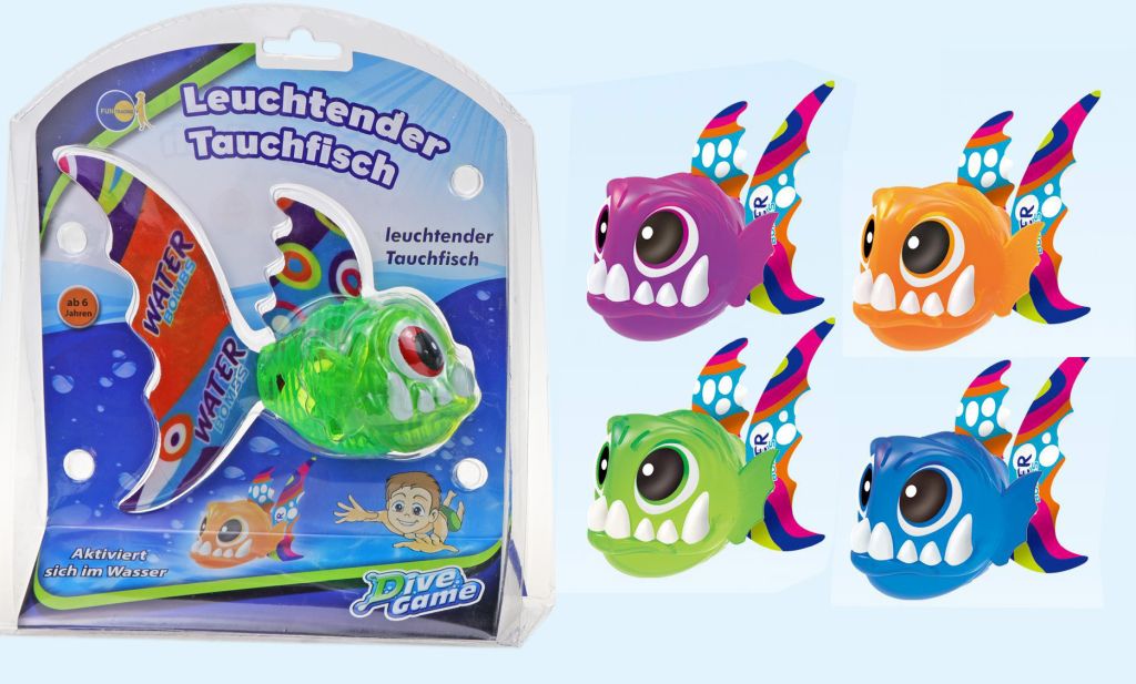 Idealna za igro pod vodo. Se osvetli, ko pride v stik z vodo. Velikost 15cm. Na voljo v štirih različnih barvah. Za delovanje potrebuje baterije 3xAGI3, ki so priložene.