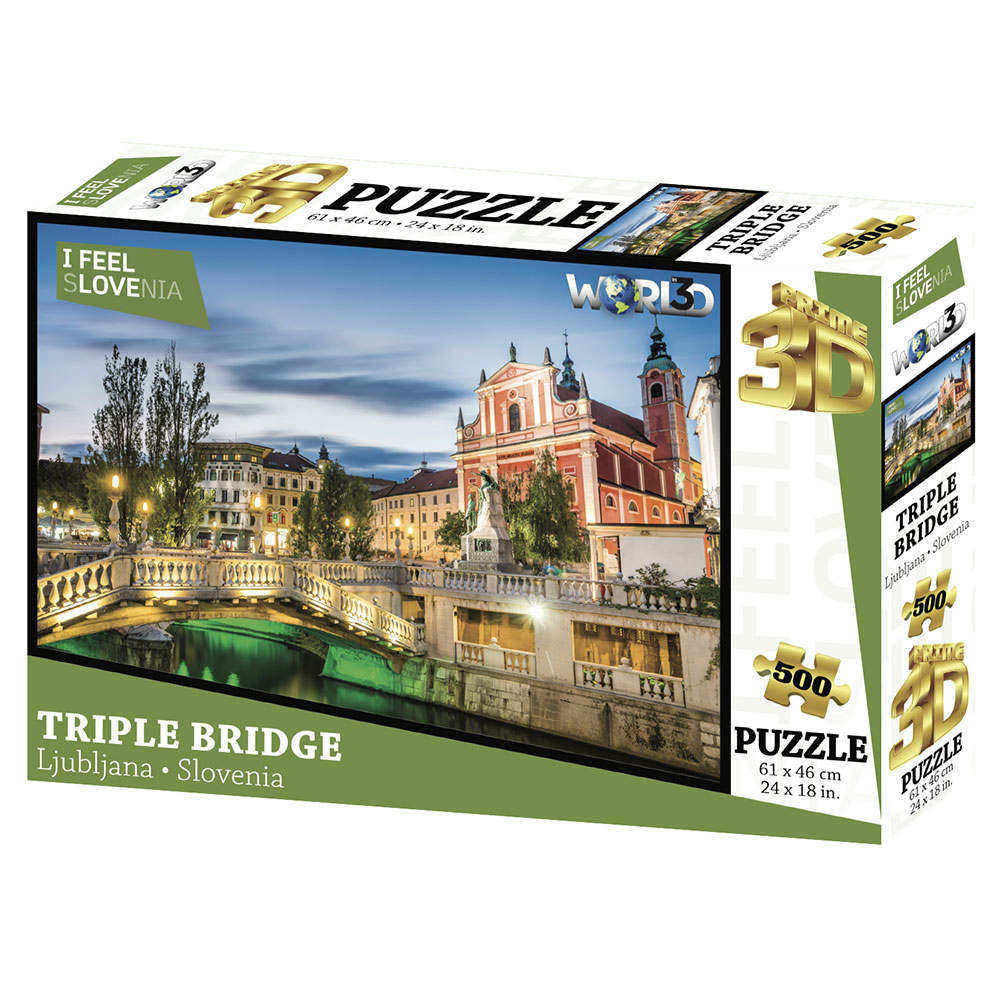 Super 3D puzzle I Feel Slovenia z neverjetno sliko slovenske znamenitosti. Dimenzija sestavljenega puzzla je 61×46 cm in vsebuje 500 koščkov.