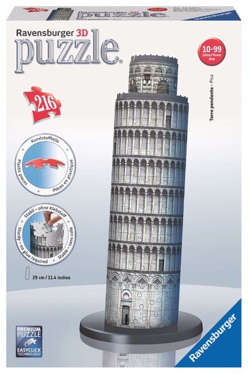 Puzzle, 3D stolp v Pisi, 216delov, velikost fi8,5cmx29cm Sestavljanko odlikuje visokokvalitetni material ter natančna izdelava koščkov. Plastični delci s klik-klik sistemom omogočajo sestavljanje brez lepila. Priložena tudi slikovna navodila za sestavljanje. Primerno za starost 10-99 let.