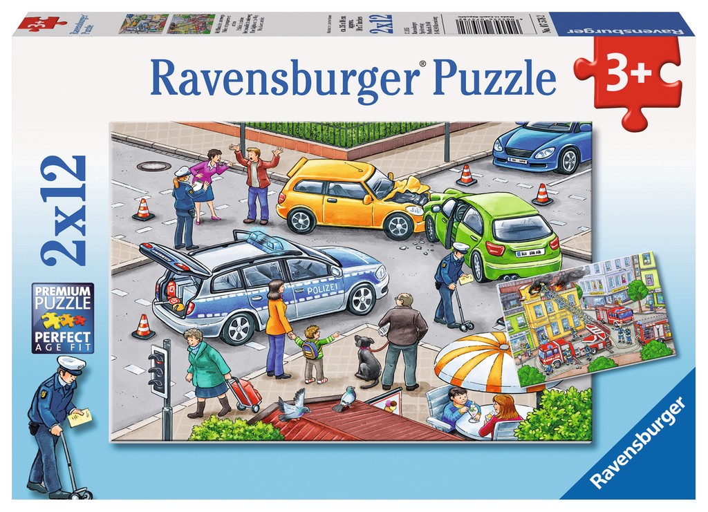 Puzzle Nesreča v mestu, trčili sta dve vozili, na pomoč hitijo policisti. Kaj pa delajo gasilci? Izbruhnil je požar, gasilci gasijo…. Sestavljanka 2×12 delov, ter mini poster, velikost slike 26 x 18cm. Pedagoško dragocen izdelek, z veliko učne zabave in izdelano iz trajnostno naravnanega gozdarstva. Primerno za starost 3l+