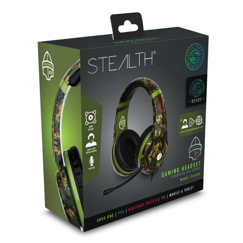 STEALTH MULTIFORMAT CAMO STEREO GAMING HEADSET – CRUISER igralne slušalke imajo odstranljiv mikrofon in vrhunske 40-milimetrske zvočnike, ki zagotavljajo impresiven zvok z velikim razponom in vsesmernim zvokom, ki vašo izkušnjo popeljejo na višjo raven. Slušalke so kot nalašč za klepetanje s svojo ekipo med spletnimi bitkami. Lahek okvir in izboljšane funkcije za udobje zagotavljajo dolgotrajno in prijetno uporabo med daljšim igranjem iger. Slušalke lahko uporabljate z XBOX SERIES X, PS5, XBOX ONE, PS4, Nintendo Switch in PC.