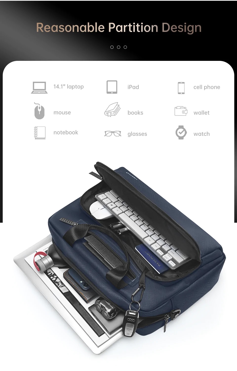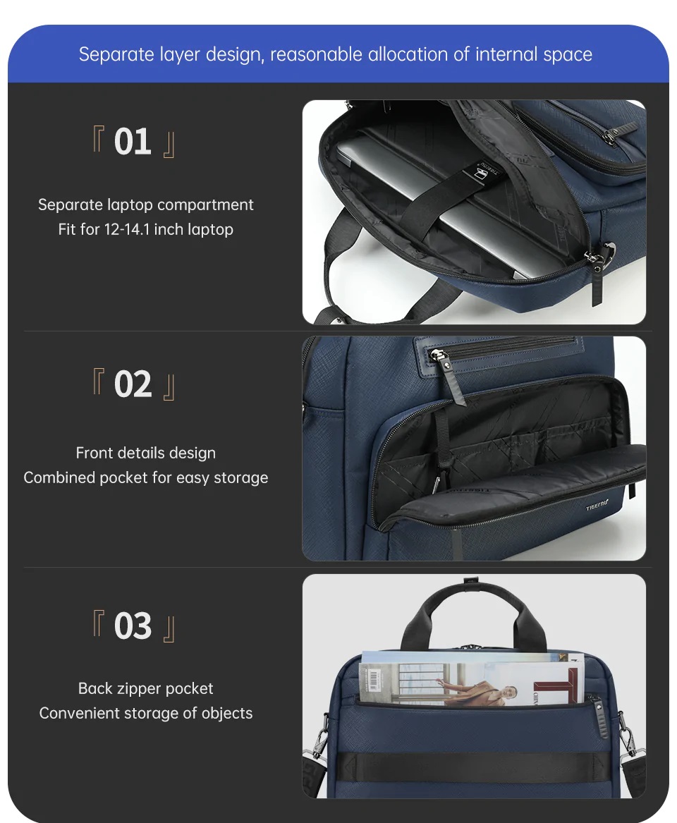 TIGERNU CANOPUS TORBA ZA PRENOSNI RAČUNALNIK 14.1″ BLUE je elegantna, poslovna torba za velikosti prenosnih računalnikov do 14,1˝. Izdelana je iz visoko kvalitetnih in vodoodbojnih materialov. Torbo lahko nosimo s priročnim, mehkim ročajem ali pa jo obesimo čez rame s priloženim in odstranljivim trakom. Z dodatnim trakom lahko torbo varno namestite na kovček na vseh poslovnih poteh.
