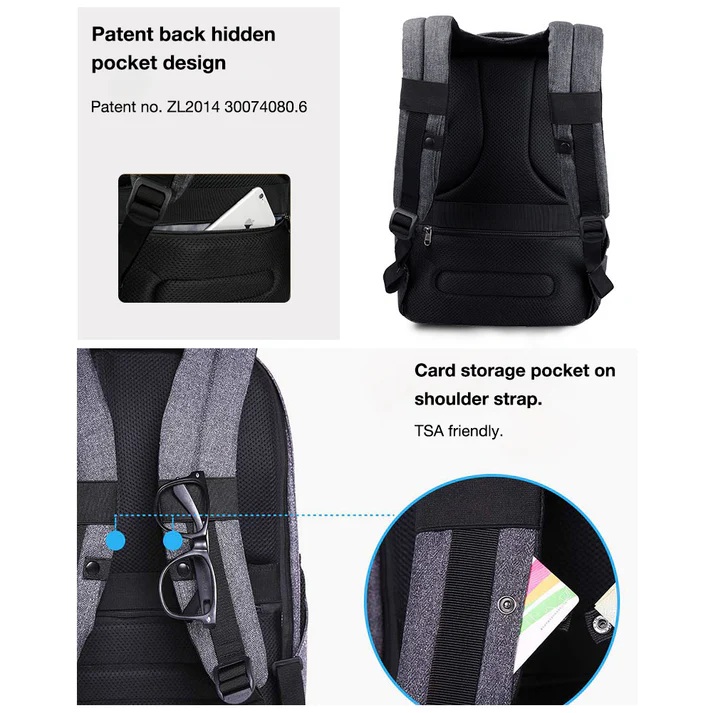 Dodatne značilnosti: Odporen na brizganje vode; Polnjenje prek USB-ja, udoben ročaj, izjemno močni šivi, kapaciteta 16L, večnamenski skriti zadnji žep varen pred krajo, odpiranje glavnega predala nahrbtnika za 90°, stranska mrežasta žepa, skrit predal za ključe, odprtina za žične slušalke, žep za shranjevanje kartic na naramnici – TSA-friendly (primeren za letališke varnostne preglede).