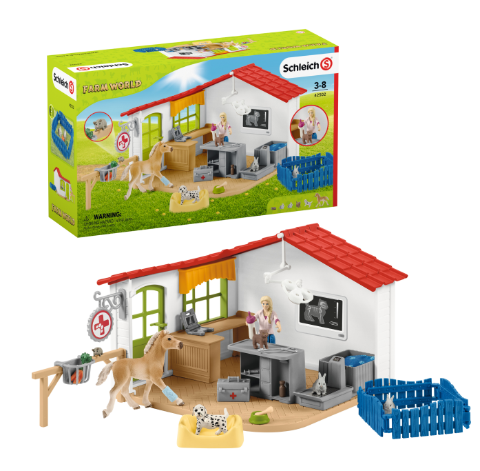 Schleich veterinarska postaja (Komplet vsebuje veterinarsko postajo, žrebička, kužka Dalmatinca, muco, 2 zajčka, miško, košaro za psa, odejo, skledo za hrano, posodo za ptije, kos za kužka, korenček, laptop, veterinarska posoda, povoje, ograjo, list z nalepkami, stetoskop). Pakirano v embalaži.