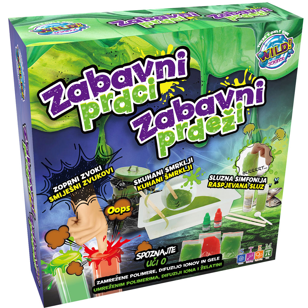 Spoznajte dolgoverižne polimere, ki omogočajo izdelavo prdečega plastelina. Občudujte svojo bogato zbirko skuhanih smrkljev. Navdušite prijatelje in prestrašite odrasle ob triprstnem izvajanju »sluzne simfonije«. Set vsebuje posebno posodo, primerno za mikrovalovno pečico, čisto prave pojme iz fizike in kemije, slikovna navodila in vse sestavine za super ZABAVO!